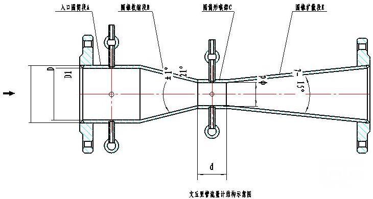 ●經典文丘里管的軸向截面見上圖。它是由入口圓筒段A、圓錐收縮段B、圓筒形喉部C、圓錐擴散段E組成。圓筒段A的直徑為D,其長度等于D;收縮段B為圓錐形,并有21°±1°的夾角;喉部C為直徑d的圓筒形,其長度等于d;擴散段E為圓錐形,擴散角7°~15°。