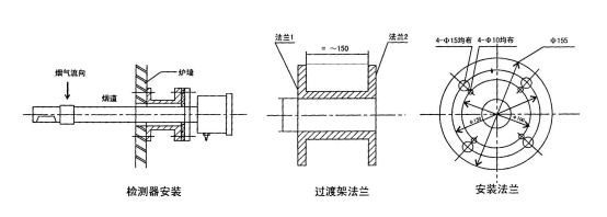 4、爐墻上的氧化鋯探頭固定法蘭裝置時(shí),用鋼材做成如圖外形的過(guò)渡架,過(guò)渡架的法蘭能直接焊在爐墻處壁上或埋入爐墻中,但請(qǐng)求氣密結(jié)實(shí)。過(guò)渡架另一端法蘭是為固定氧化鋯探頭而設(shè),因而必需與氧化鋯探頭固定法蘭的螺孔相匹配。如選用由12mm裝置孔,則將過(guò)渡架法蘭的¢125mm圓上均布四個(gè)¢12mm的裝置孔,運(yùn)用4個(gè)M1O×40的螺絲,將它與檢測(cè)器的固定法蘭緊固,為避免漏氣,兩法蘭間可填充橡膠紙板密封圈。