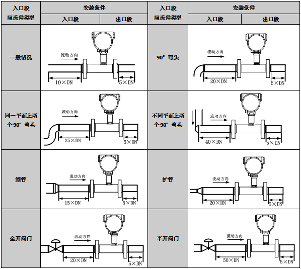 渦輪流量計對管道內(nèi)流速分布畸變及旋轉(zhuǎn)流是敏感的,進入傳感器應(yīng)為充分發(fā)展湍流,因此要根據(jù)傳感器上游側(cè)阻流件類型配備必要的直管段或整流器,要求入口段和出口段直管段長度。