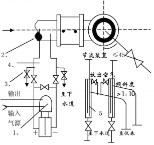 測量介質為清潔的氣體流量時,裝置方式普通為差壓變送器高于、低于節(jié)流安裝兩種取壓口位置應契合上述裝置請求,當差壓變送器低于節(jié)流 安裝時,導壓管必需向下彎至差壓變送器,并在*低處安裝放水閥和堆積器。
