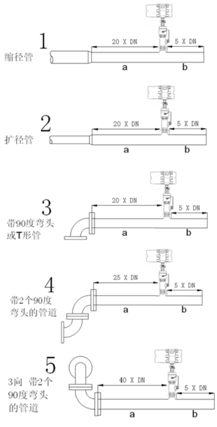選擇程度直管段裝置,裝置點(diǎn)表前和表后的直管段請求為:裝置點(diǎn)上游的節(jié)流元件距裝置點(diǎn)必需大于 5 倍管道直徑,裝置點(diǎn)下游的節(jié)流元件距裝置點(diǎn)必需大于 3 倍管道直徑,有條件的狀況我們倡議盡量使表前表后直管段長些。
