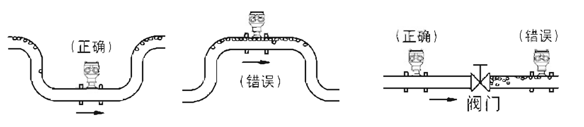 假如有氣泡九如丈量管,流量顯現(xiàn)會遭到影響,而且還會呈現(xiàn)丈量錯誤。當流體中含有氣泡時,管路設(shè)計時必需避免氣泡積聚在丈量管中。假如在丈量管左近存在閥門,應(yīng)盡量將管布置在閥門上游,可防止壓力減小產(chǎn)生氣泡。