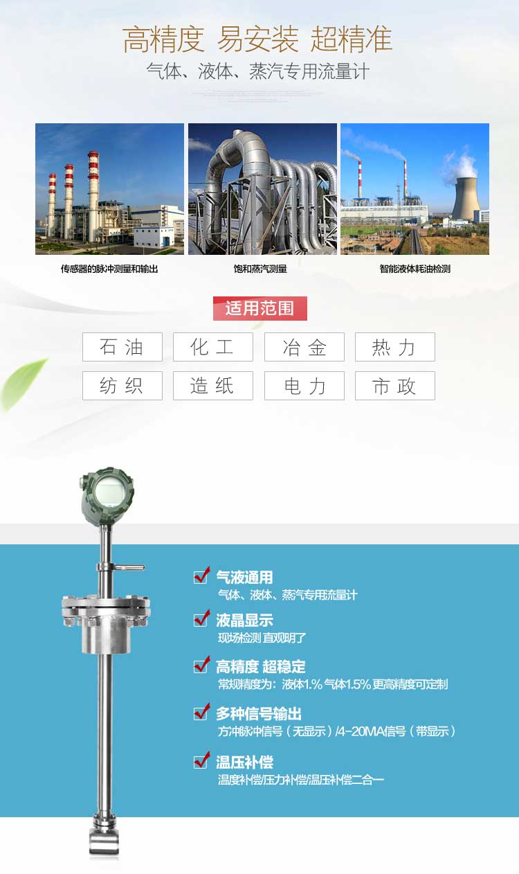 插入式渦街流量計**適用于石油、化工、冶金、熱力、紡織、造紙等行業(yè)對過熱蒸汽、飽和蒸汽、壓縮空氣和一般氣體(氧氣、氮氣氫氣、天然氣、煤氣等) 、水和液體(如:水、汽油、酒精、苯類等)的計量和控制。