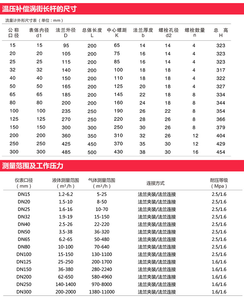 4、渦街流量計的下限流量取決于介質的工況密度和運動粘度,其上限流量一般不受介質壓力和溫度的影響,因此確定流量范圍只要確定實際可用的下限流量即可。計算出下限流量后,查流量范圍表即可確定相應口徑。