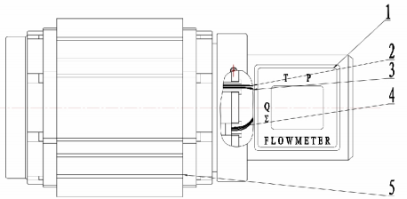 氣體腰輪流量計有5個部分組成,分別為:1、本安型體積修正儀;2、流量傳感器;3、壓力傳感器;4、溫度傳感器;5、氣體羅茨流量計(機械)