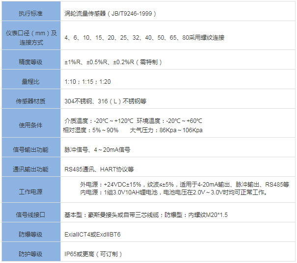 三、小口徑渦輪流量計技術參數(shù)