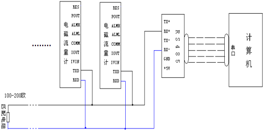 將電磁流量計(jì)的TXD和RXD與RS485的RX+和RX-(TX+和TX-也可)相連,假如接的線比擬長(zhǎng)請(qǐng)您在遠(yuǎn)端加一個(gè)100-200歐的匹配電阻,再把RS485插到微機(jī)的串口。