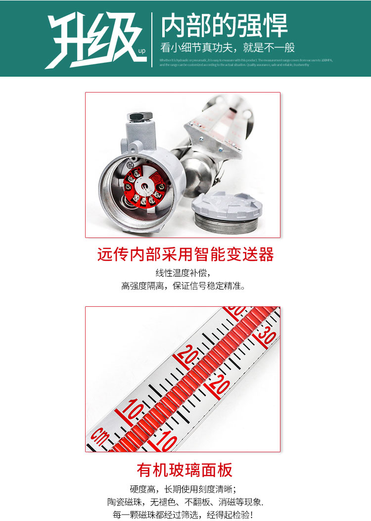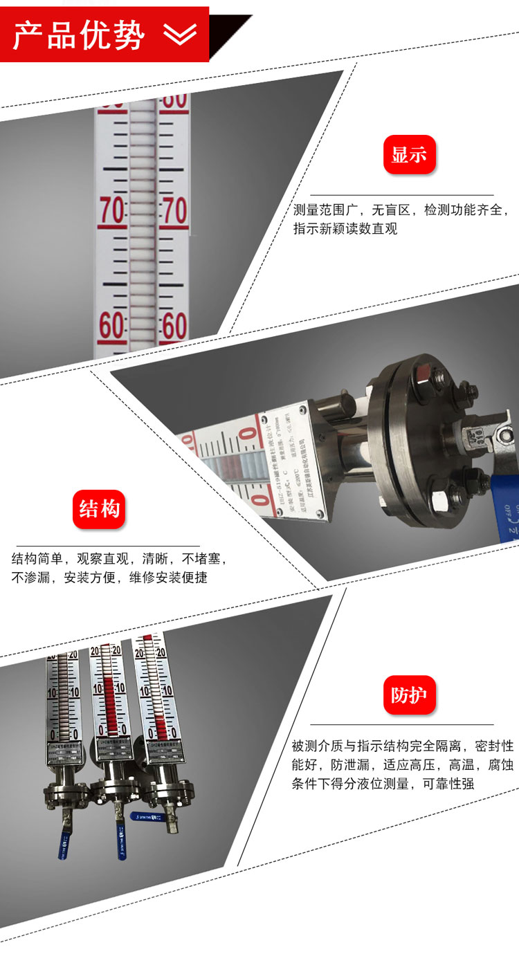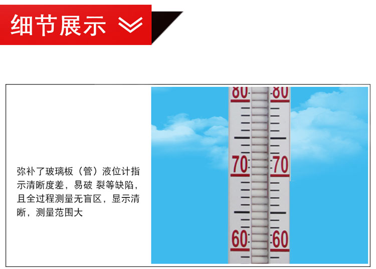 1、顯示器以紅色指示液位,上部白色區(qū)域?yàn)闊o(wú)液部分,顯示直觀、醒目、夜明效果好。