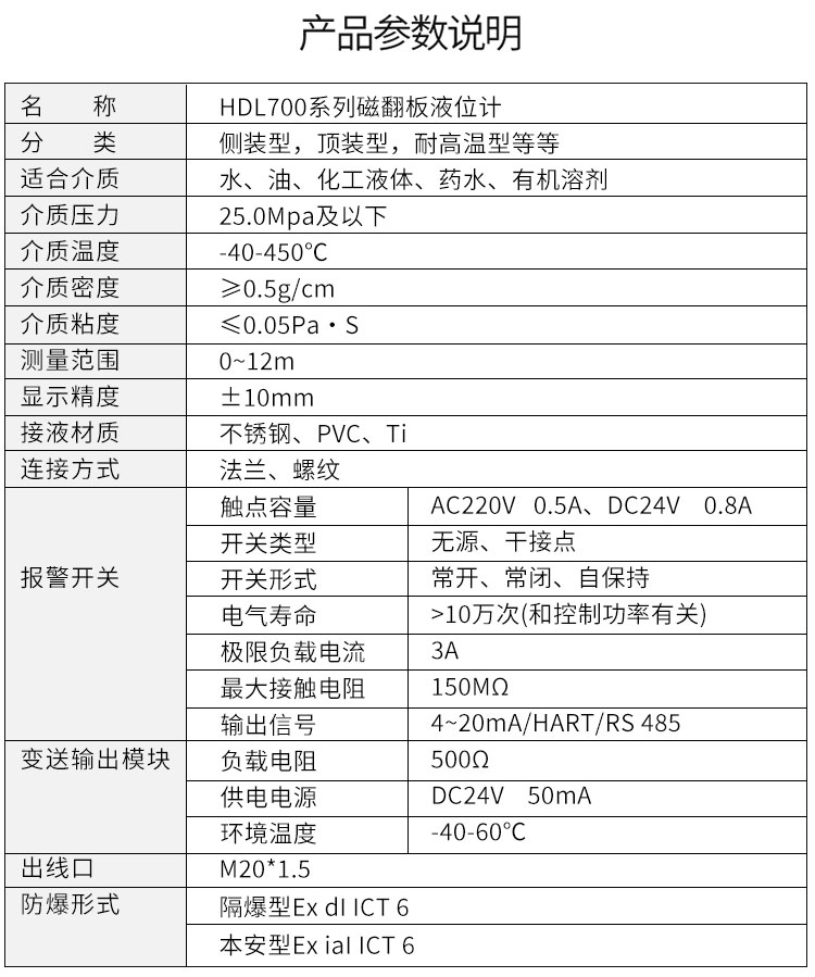 配上液位變送器就能遠(yuǎn)距離傳送液面的位置信號(hào),通過(guò)一定的電氣裝置達(dá)到自動(dòng)控制和測(cè)量液位的目的。液位計(jì)是具有可靠安全性的檢測(cè)儀表。由于具有磁性藕合的隔離密閉結(jié)構(gòu),尤其適用于易燃、易爆和腐蝕有毒液體的液位檢測(cè),從而使原復(fù)雜環(huán)境的液位檢測(cè)手段變的簡(jiǎn)單和可靠安全。