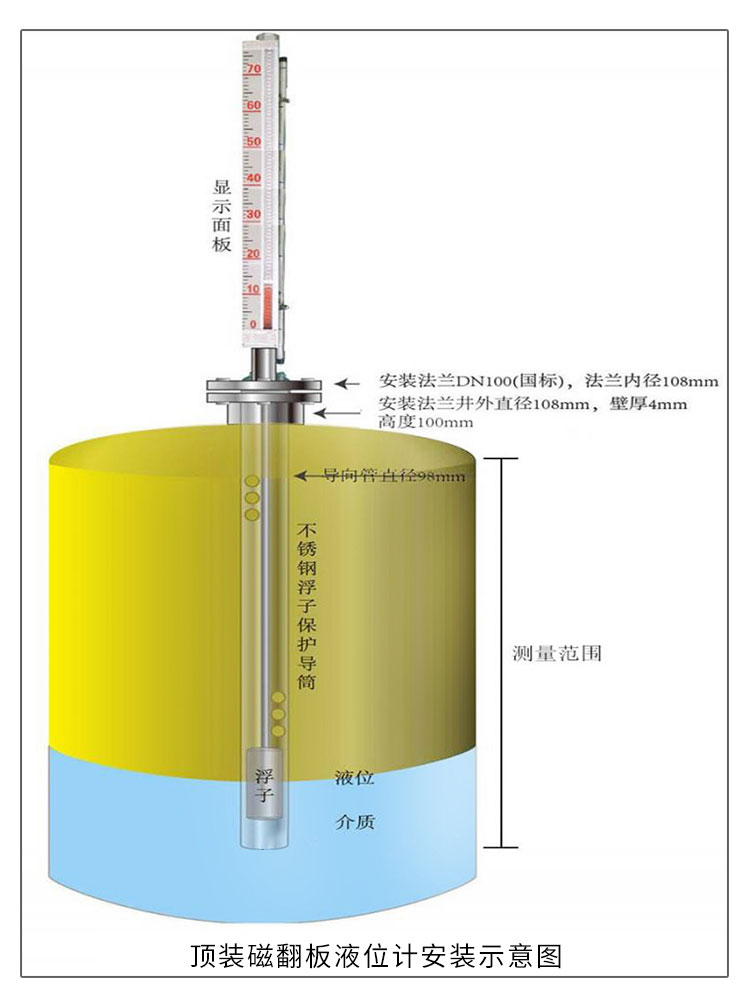 3、液位計(jì)安裝完畢后,需用磁鋼進(jìn)行校正,對(duì)磁翻柱導(dǎo)引一次,使零位以下顯示有紅色,零位以上顯示為白色。